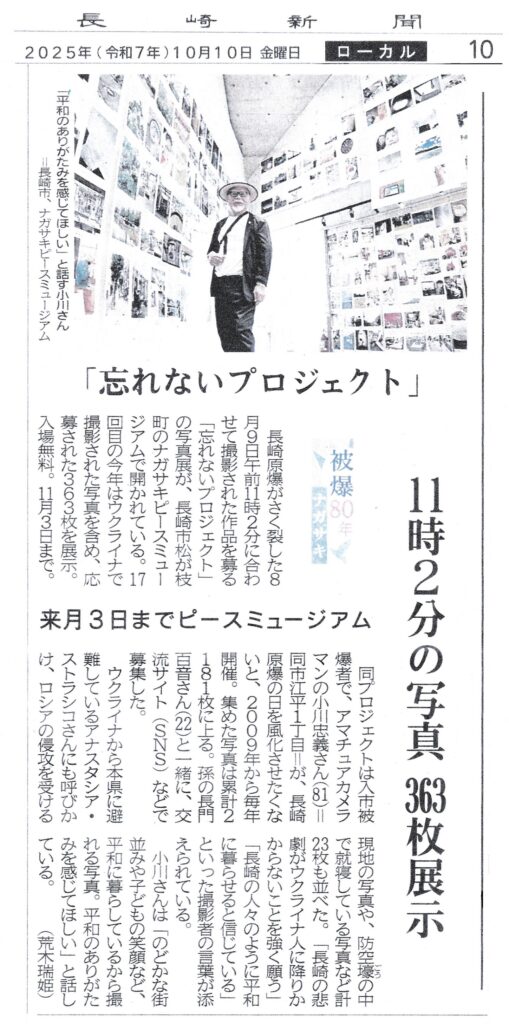 同プロジェクトは入市被爆者で、アマチュアカメラマンの小川忠義さん(81)=同市江平1丁目=が、長崎原爆の日を風化させたくないと、2009年から毎年開催。集めた写真は累計2181枚に上る。孫の長門百音さん(22)と一緒に、交流サイト(SNS)などで募集した。