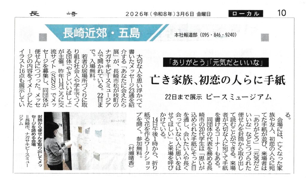 「あなたに会えたら展」の模様が3月6日付で長崎新聞に掲載されました。全文を紹介します。