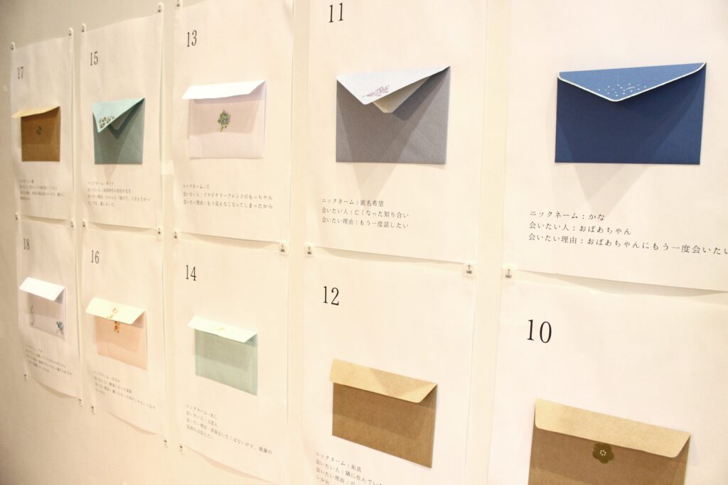 会場には、亡くなった家族や友人、初恋の人らに宛てた手紙が並び、来場者は「ありがとう」 「元気だといいな」などとつづられた便せんを封筒から取り出して読むことができる。来場者が大切な人に宛てて手紙を書けるコーナーもある。