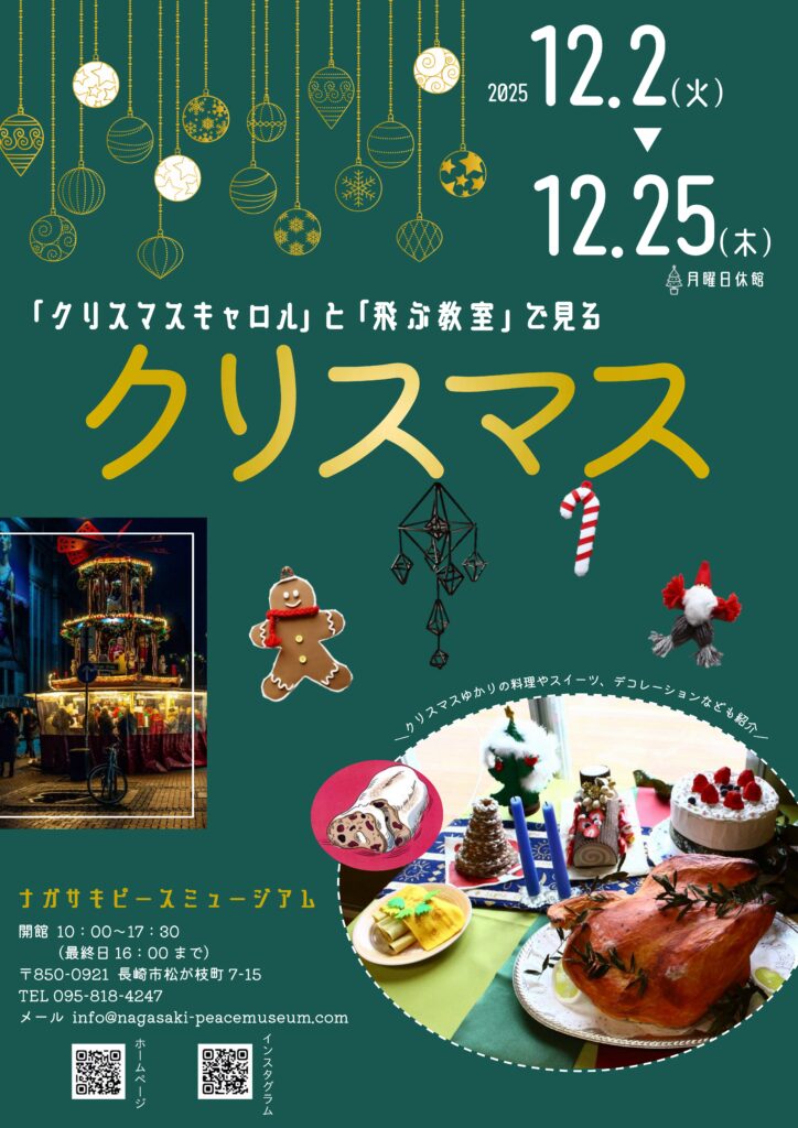 12月252025 「クリスマスキャロル」と「飛ぶ教室」で見るクリスマス 12/2~12/25 「クリスマスキャロル」と「飛ぶ教室」で見るクリスマス クリスマスと聞いてあなたは何を思い浮かべますか? ケーキにチキン、クリスマスツリー、イルミネーションなど… 多くの方が思い浮かべるかもしれません。 今回ナガサキピースミュージアムではクリスマスのもっとも有名な2つの物語、チャールズ・ディケンズの「クリスマス・キャロル」とエーリヒ・ケストナーの「飛ぶ教室」を通して、このクリスマスの時期に優しさや思いやりの気持ちにも目を向けて欲しいと考え、作品の一部を紹介します。 合わせて、世界各地のクリスマス飾りや料理についてパネル(イラスト:岡本典子さん)や立体で作成したものと、ドイツのクリスマスマーケットの写真(撮影:サトミ・ヘニックフェルトさん)を展示します。 期間2025年12月2日(火)~12月25日(木) 開館10:00~17:30 ※最終日16時閉館 休館日12月8日(月)、15日(月)、22日(月) 入館料無料